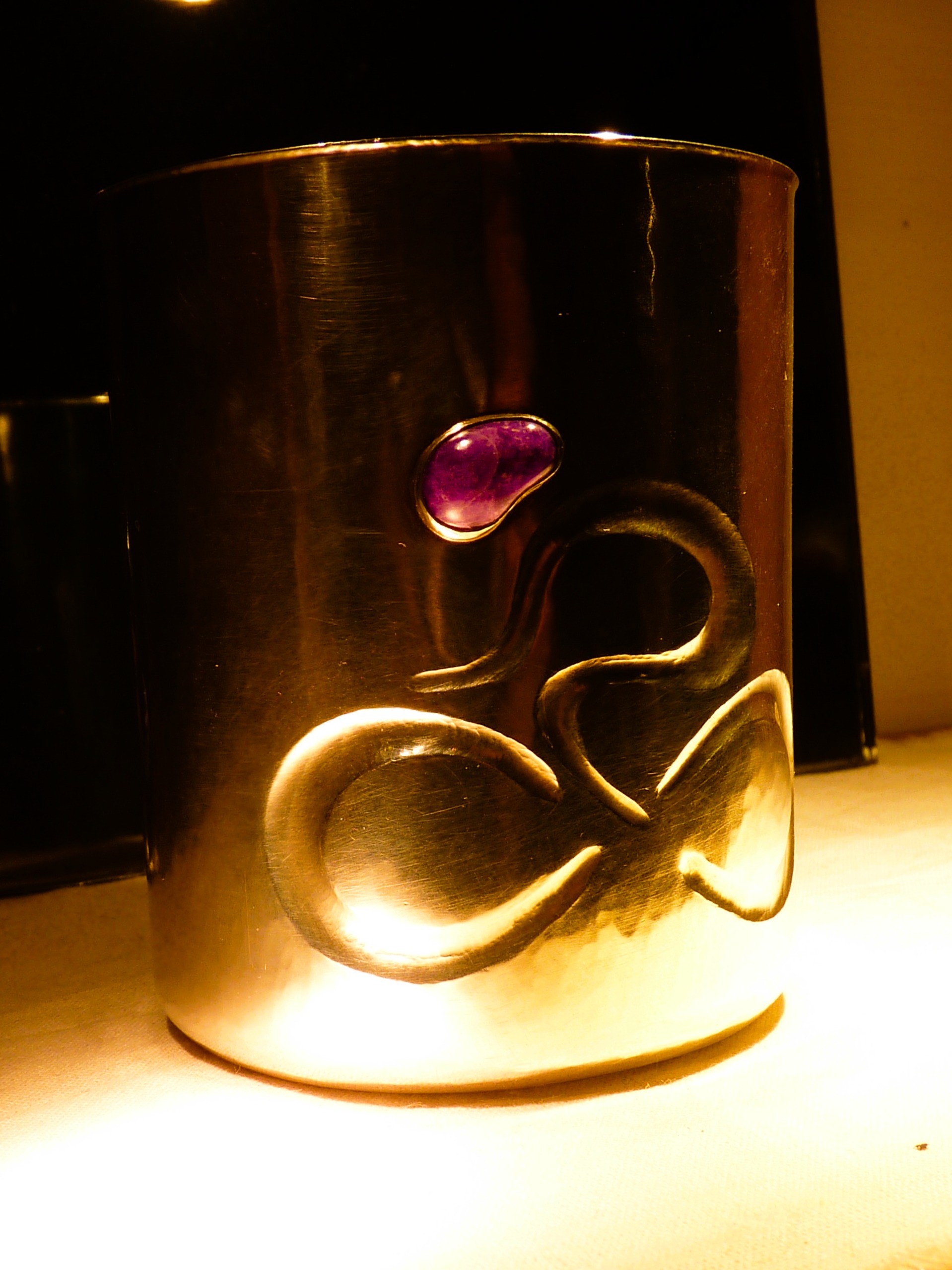 Auch in einem silbernen Becher besteht der Boden aus Achat, wenn man ihn austrinkt erscheint er wie zur Belohnung. Erinnerungen an die Suppenteller-Bilder der Kindheit. Der kleine Prinz, oder Schmetterling.